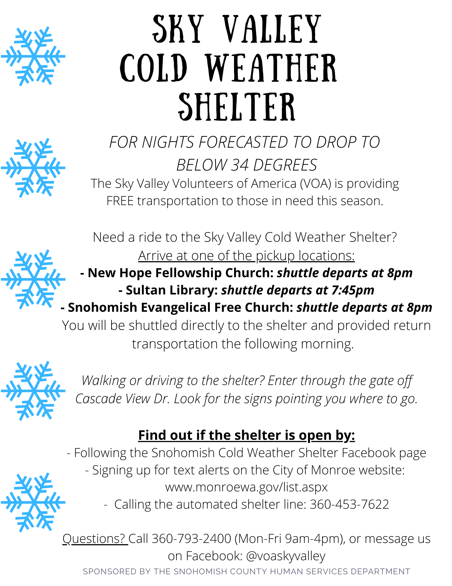 The Sky Valley Cold Weather Shelter is open for nights forecasted to drop to below 34 degrees. Click here for information and click here for direction to Cold Weather Shelter